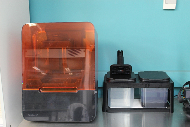 Formlab Form 3+ printer with LFS (Low Force Stereolithography) technology with a printing volume of 144.78 x 144.78 x 185.42 mm. It can print pieces with a resolution between 25 -300µm on the Z axis and 25µm on the XY axis in thirty different materials.