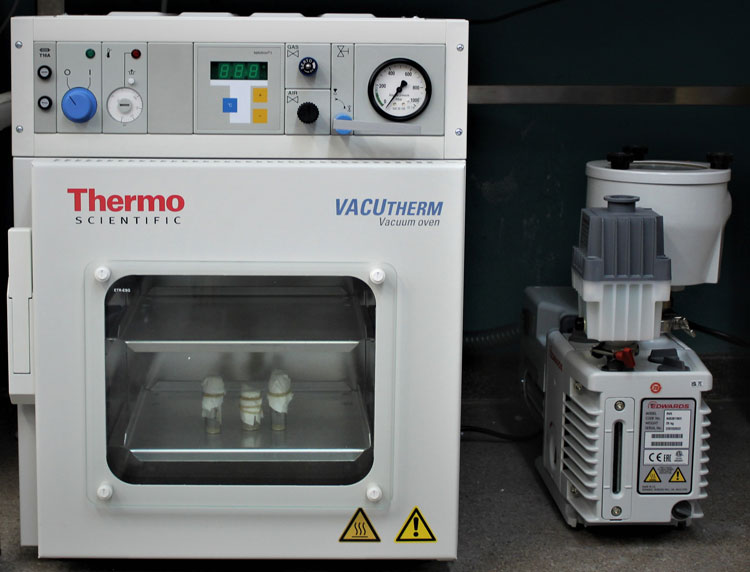 The vacuum oven is used to dry and activate samples under vacuum or under nitrogen atmosphere. It is used for applications requiring heating and vacuum conditions. It has an inner volume approx.. 25 L, it can operate with temperatures above 200ºC, the possible vacuum is up to 0.01 mbar. The oven...